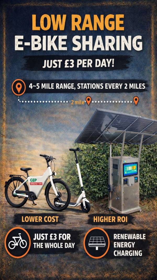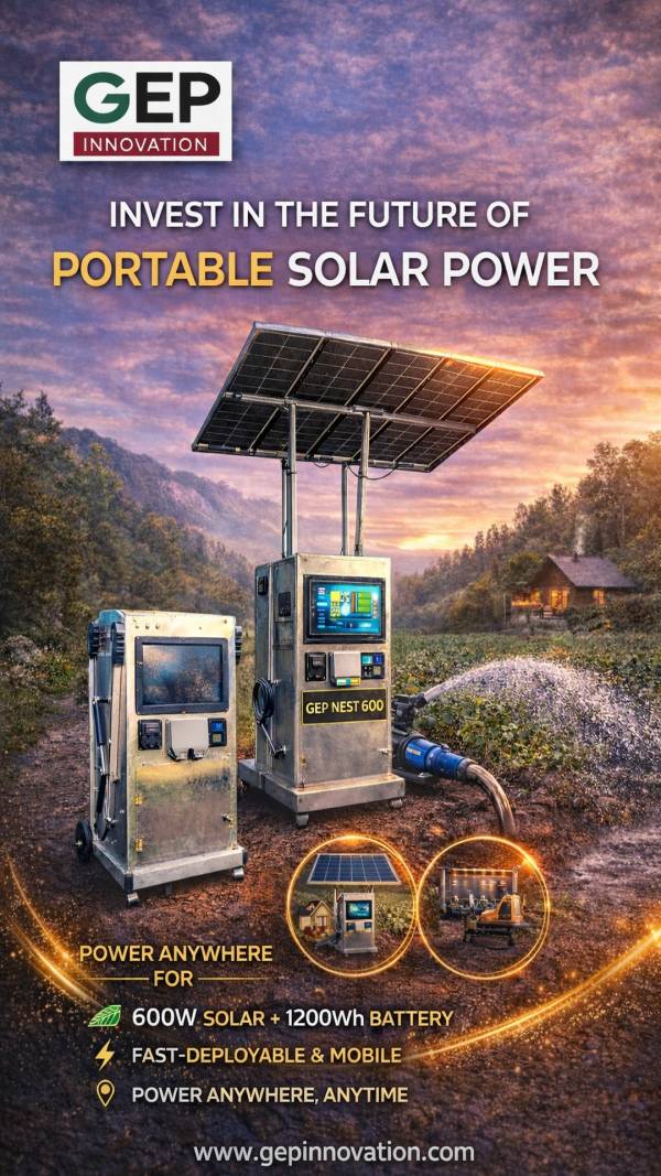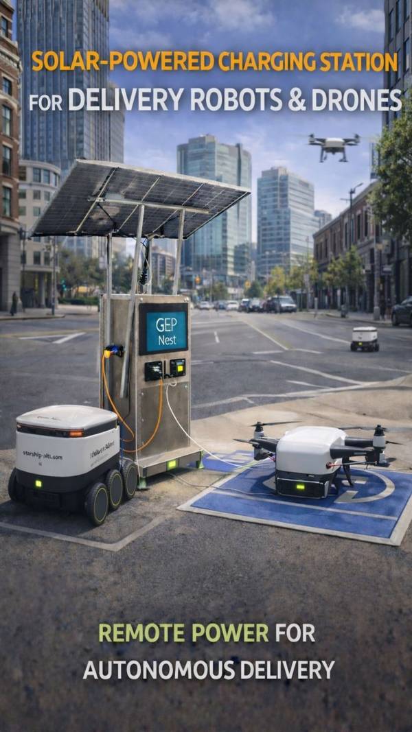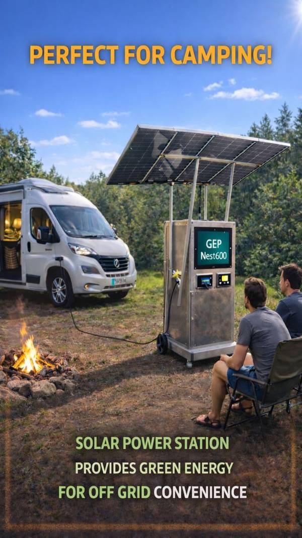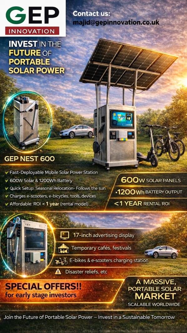 GEP Nest 600 is a portable, solar-powered smart energy unit designed for the UK’s real-world micromobility charging needs. It delivers clean, off-grid power for e-scooters and e-bikes, combining power generation, battery storage, charging capability, and shelter in one mobile unit—deployable in under 10 minutes.